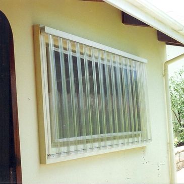 Polycarbonate panels work like aluminum, but they let in light and maintain visibility during storms. We recommend aluminum for tall openings and polycarbonate for windows under 60".